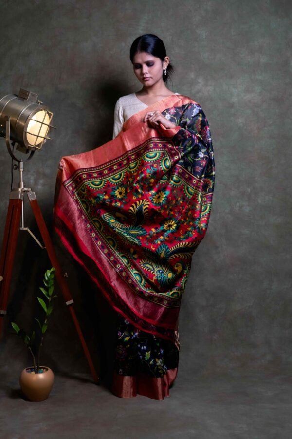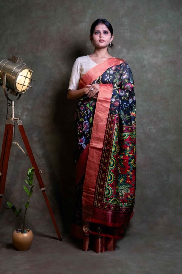 Raw silk Kalamkari refers to a unique combination of two traditional Indian textile arts: raw silk weaving and Kalamkari printing. Here’s a detailed description: